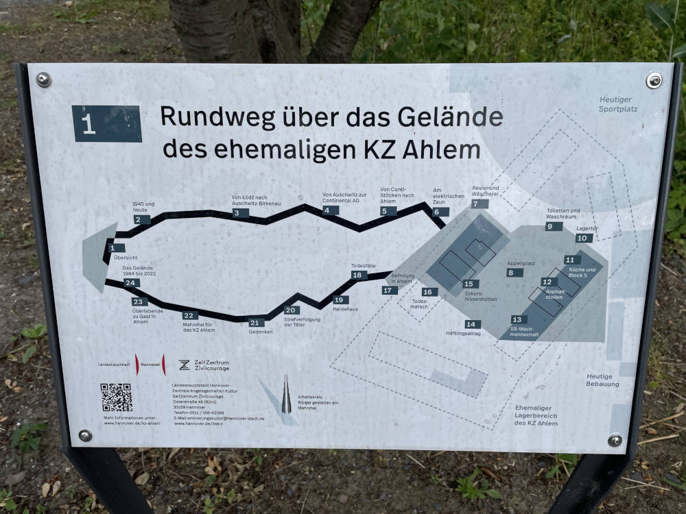 Das Mahnmal für das KZ Ahlem ist auf Initiative des Arbeitskreises „Bürger gestalten ein Mahnmal“ entstanden und wurde am 4. Februar 1994 durch den damaligen Oberbürgermeister Herbert Schmalstieg der Öffentlichkeit übergeben. Es ist über die Petit-Couronne-Straße und den Fußweg Am Mahnmal zu erreichen und besteht aus einem symbolischen Stollengang mit 750 Asphaltplatten in der Spitze, jede steht für einen umgekommenen Häftling. Senkrechte Bahnschienen (siehe Deckblatt) symbolisieren die Arbeit im Stollen und die Deportationen der KZ-Häftlinge mit der Reichsbahn. Der Gedenkplatz erinnert an den ehemaligen Appellplatz.
